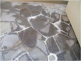 石貼りの床の目地から白華が出ています。 石が浮いているため、石の下に水がまわりセメントのアクが出てきた事象です。 →石の張替えをお願いしました。 |