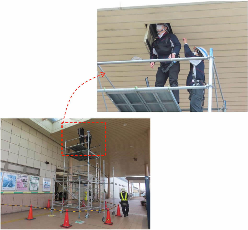 【月間トピックス】2025年12月号 浦安市から依頼を受けて、JR舞浜駅の陸橋通路の経年劣化検証を行いました。通路の屋根は、折版やガラス素材で出来ていますが、鋼材の損傷や漏水の現象がないかを超短波厚さ計や水分計、サーモグラフィックカメラなどを使用しながら検証をしました。 高さ6mを超える通路の天井裏を診るため、ローリング足場を組んで、天井裏から診断しています。