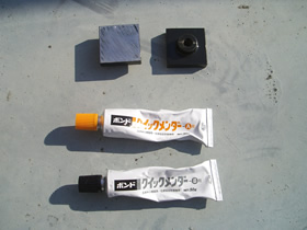 4cm×4cmの付着板に2液のボンドを付けます。 |