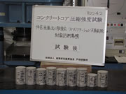 コア抜きした検体を耐圧試験機により荷重をかけ、破壊するまでの最大荷重を計測します。 その後、試供体の断面積で割り圧縮強度を算出します。 コア試供体の径は、最大粗骨材寸法の3倍以上とされているので、75mm以上は求められます。